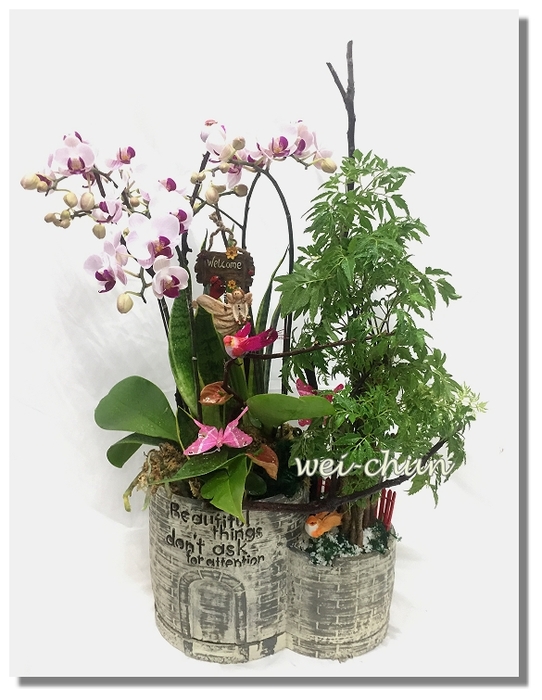 高雅的蘭花,搭上細碎動感的福祿桐盆栽,增加了空間感,再加上庭園造