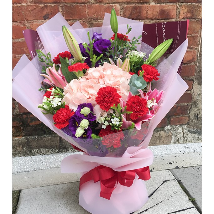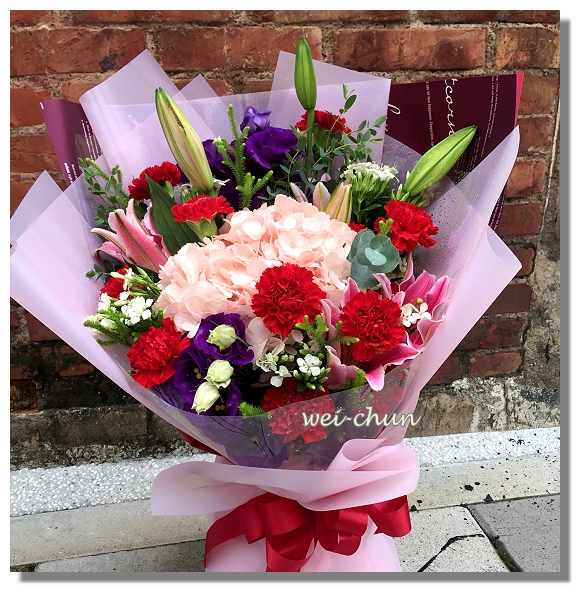 花材:繡球花+康乃馨+百合+洋桔梗+葉材